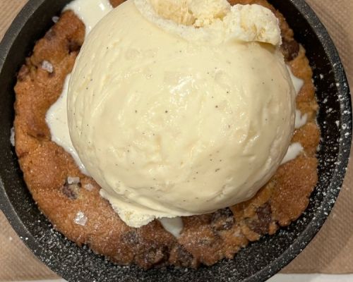 Warm chocolate chip cookie topped with sea salt and vanilla ice cream